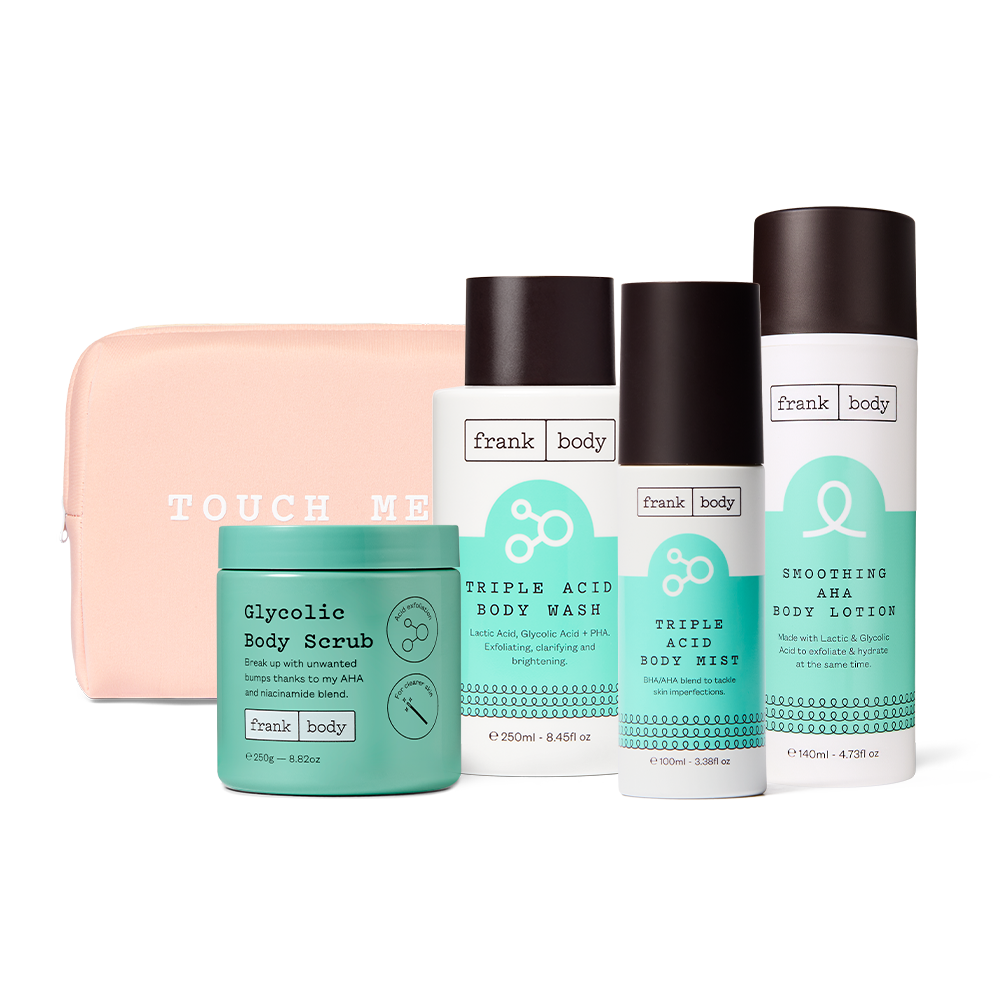 Triple Acid Body Mist: Water (Aqua), Propanediol, Glycolic Acid, Niacinamide, Aminomethyl Propanol, Butylene Glycol, Lactic Acid, Salicylic Acid, Zinc PCA, Hamamelis Virginiana Leaf Extract, Glycyrrhiza Glabra Root Extract, Centella Asiatica Extract, Glycerin, Heptyl Glucoside, Heptanol, Phenoxyethanol, Ethylhexylglycerin, Sodium Benzoate, Potassium Sorbate, Citric Acid, Fragrance (Parfum), Limonene, Linalool, Benzyl Benzoate, Benzyl Salicylate.